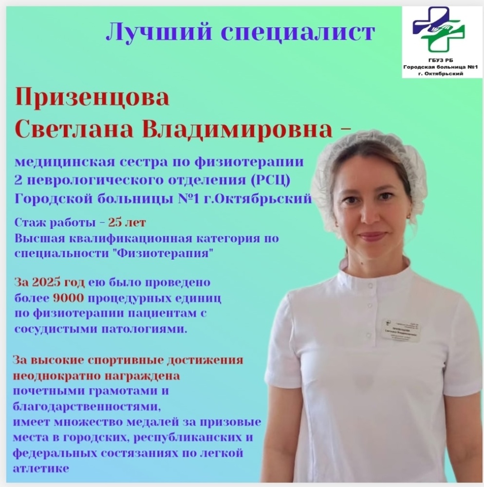 Знакомьтесь с нашей героиней - Призенцова Светлана Владимировна, медицинская сестра физиотерапии 2 неврологического отделения (РСЦ) Городской больницы №1 г.Октябрьский.